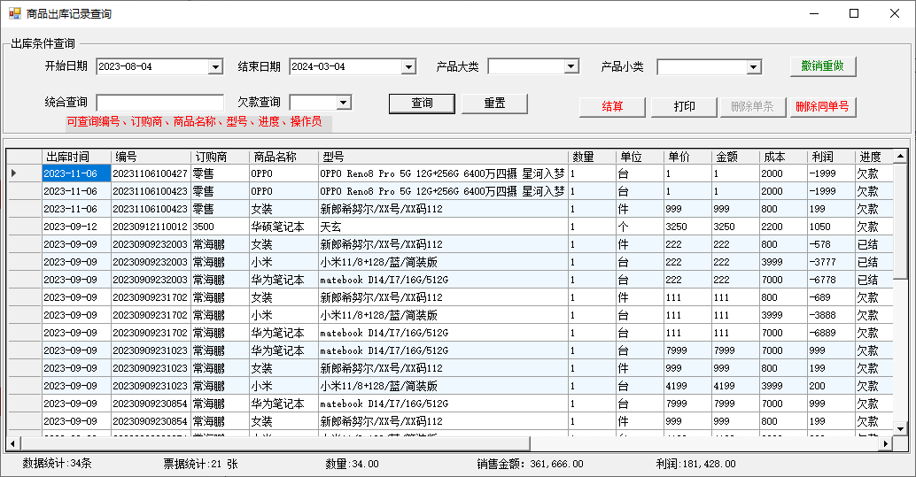 产品入库,产品出库,客户管理,利润统计,库存盘点,打印单据,欠款查询,生成报表,SN唯一码入库 出库,权限管理,首字母查询,首字母出库,数据备份,数据还原等。